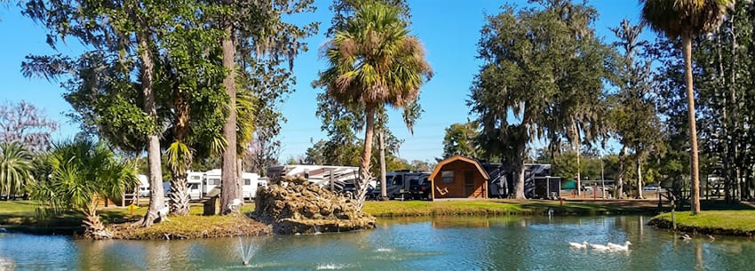 OCALA is located in the country setting of Northern Florida and is home to more than 1,000 horse farms and training centers. Ocala RV Camp Resort is in a private RV camping setting with a great location surrounded by a natural environment of beauty with oak and magnolia trees. Our pet friendly campground is conveniently located and offers Easy On/Off to the Highway. Our Log Cabins are located around scenic ponds where you will see ducks and other Florida birds.